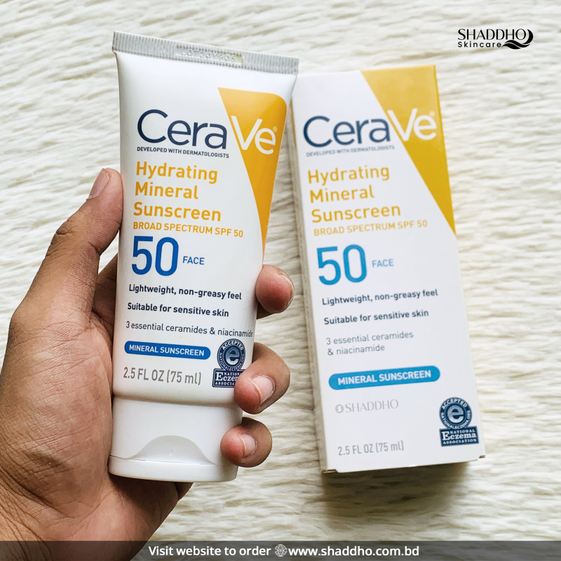 Protect your skin without compromise with CeraVe Hydrating Mineral Sunscreen SPF50. This dermatologist-developed, 100% mineral-based sunscreen offers broad-spectrum protection using zinc oxide and titanium dioxide while nourishing your skin with essential ceramides and hyaluronic acid. Ideal for sensitive, dry, and eczema-prone skin, it defends against harmful UVA/UVB rays and supports long-lasting hydration.