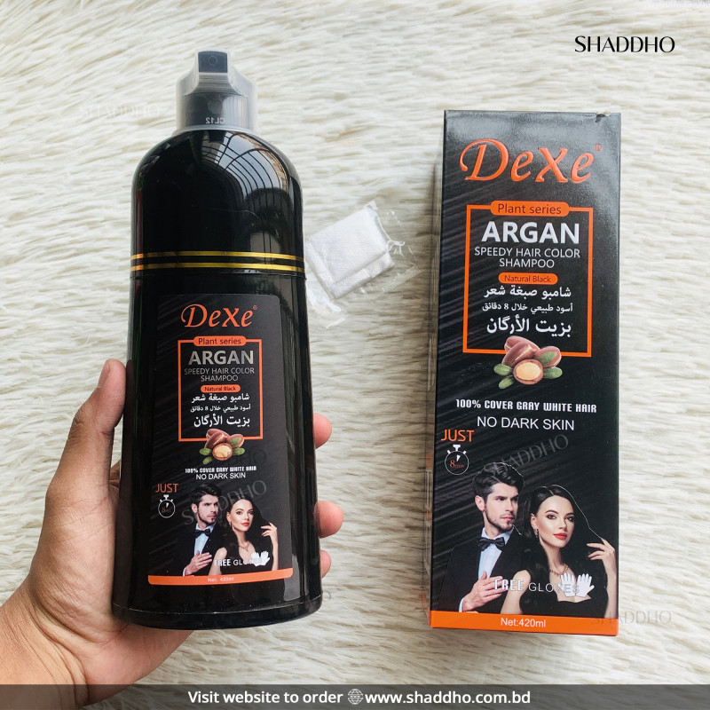 Dexe Argan Speedy Hair Color Shampoo Natural Black 420ml is a fast-acting hair color shampoo designed to turn gray or dull hair into a rich natural black shade in just a few minutes. Infused with argan oil and herbal extracts, it not only colors your hair but also helps nourish and condition it during application. This easy-to-use shampoo formula delivers salon-like results at home, making hair coloring quick, convenient, and affordable.