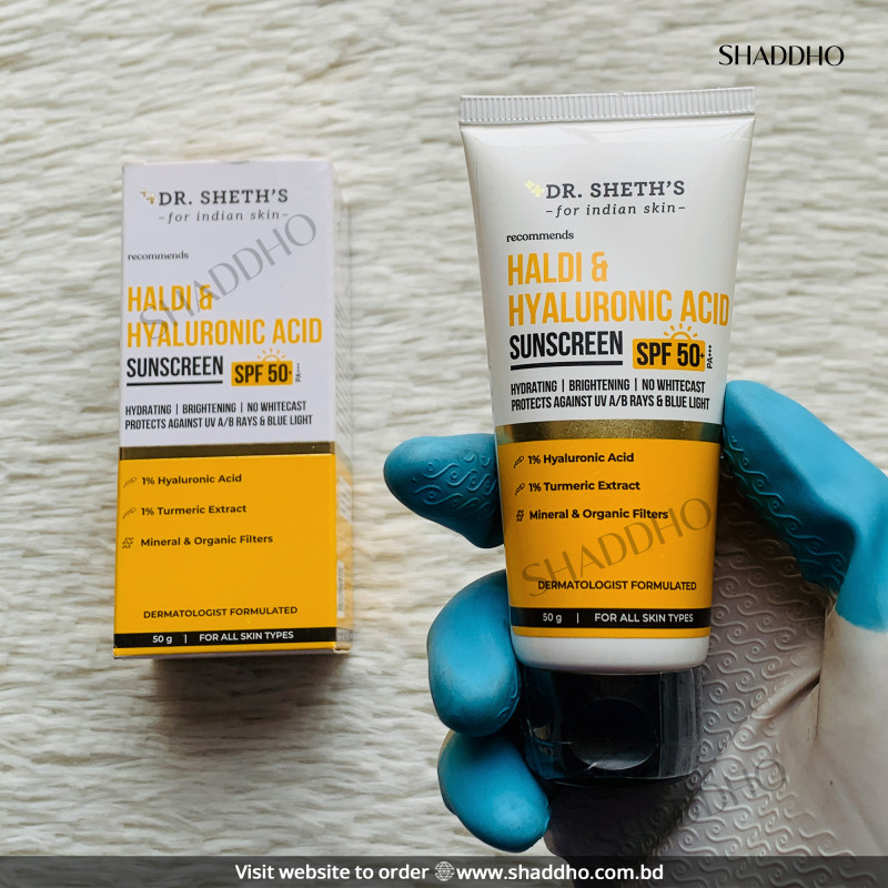 Dr. Sheth’s Haldi & Hyaluronic Acid Sunscreen SPF50+ PA+++ is more than just sun protection—it's daily skin defense tailored for Indian skin. With its powerful blend of science-backed ingredients and Ayurvedic goodness, it hydrates, soothes, and protects in one step. A must-have in your skincare routine for healthy, radiant, and sun-safe skin.