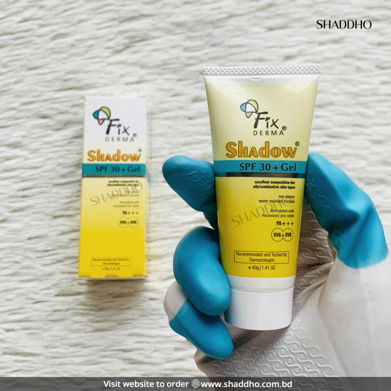 Protect your skin from harmful UV damage while keeping it fresh and hydrated with Fixderma Shadow Sunscreen SPF 30+ PA+++ Gel (40g). Designed to shield your skin from both UVA and UVB rays, this lightweight gel sunscreen blends powerful protection with a non-greasy finish — ideal for daily use on all skin types, especially combination and oily skin.