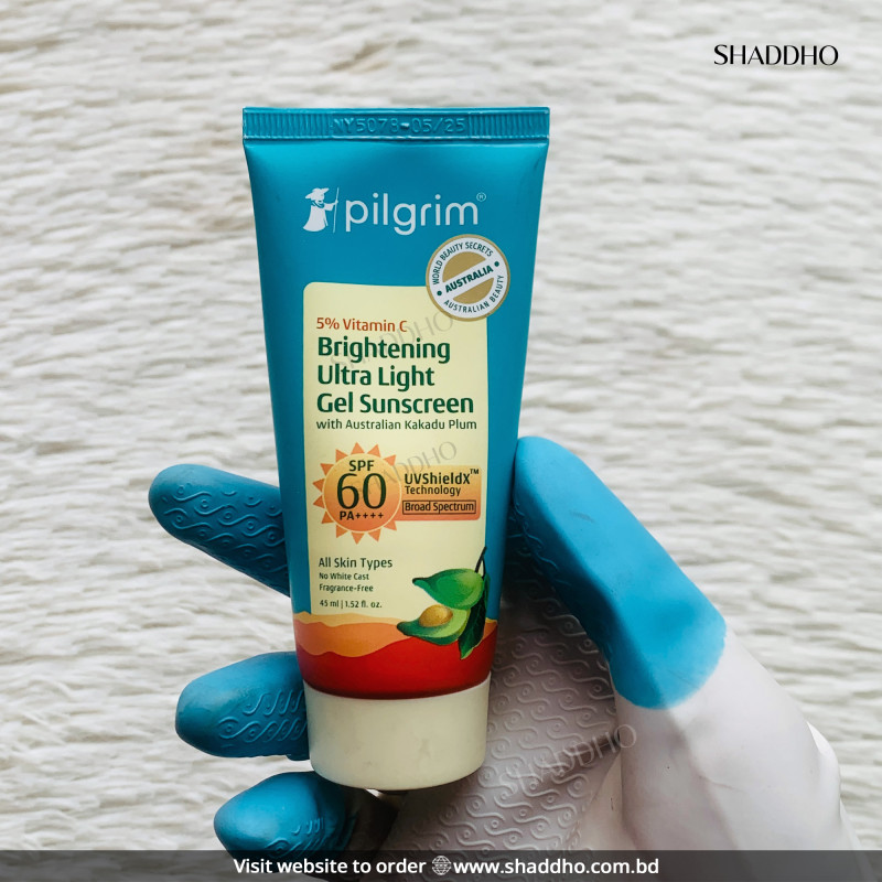 Experience superior sun defense and visible radiance with Pilgrim 5% Vitamin C Brightening Ultra Light Gel Sunscreen SPF 60 PA++++ (45ml) — your perfect daily shield for hydrated, glowing, and protected skin.